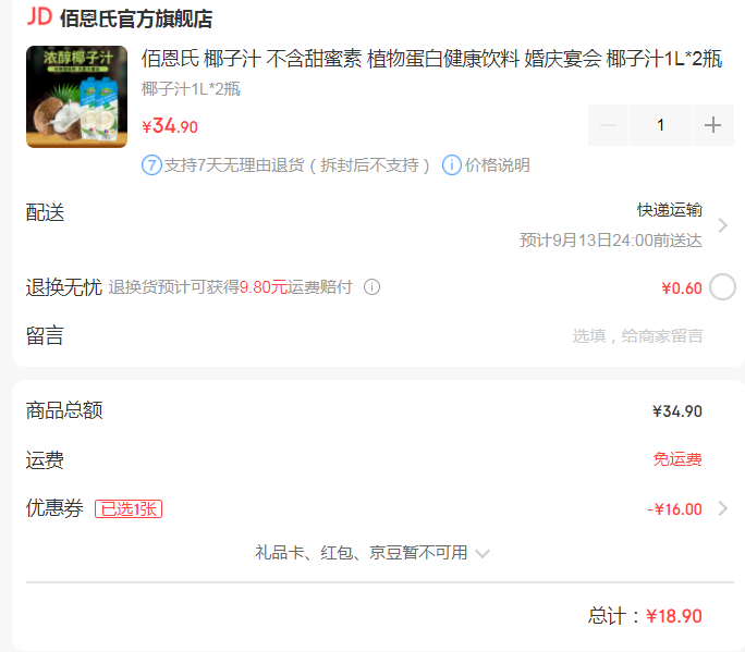 Baienshi 佰恩氏浓醇椰子汁1l 2瓶18 9元包邮 需用券